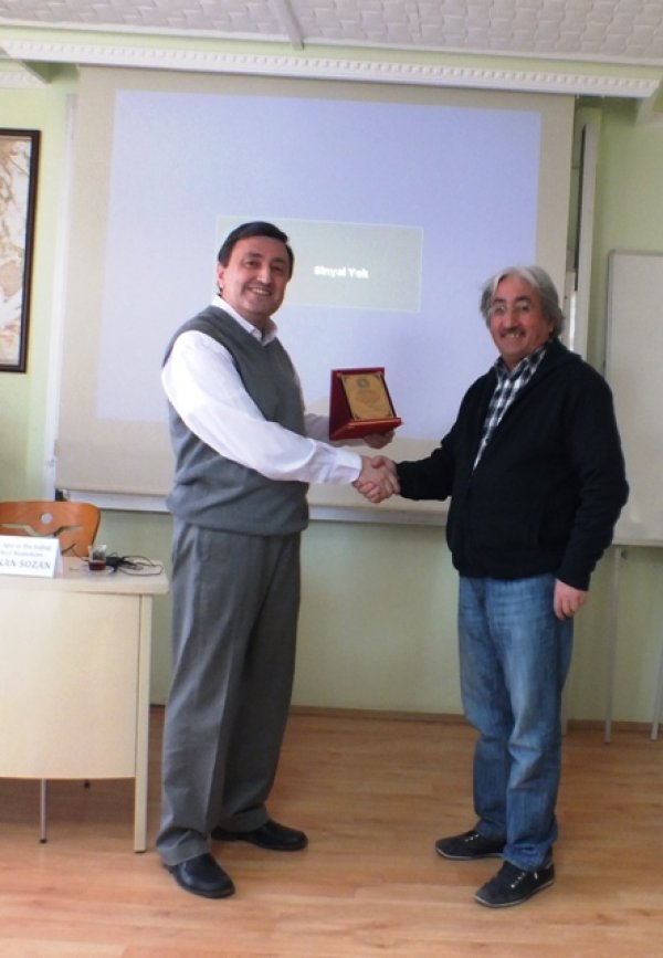 Söyleşinin sonunda Sayın Volkan SOZAN’a Enstitü adına yönetim kurulu üyesi Battalgazi ALICIOĞLU tarafından, günün anısına bir plaket takdim edildi.
