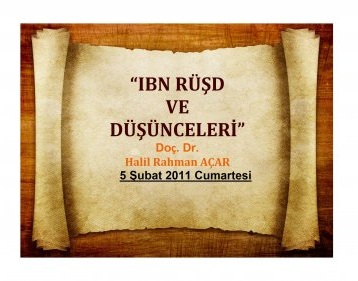 05 Şubat 2011 Cumartesi 14.00’te Enstitümüz Zemahşerī Müzakere Meclisinde Yrd. Doç. Dr. Halil Rahman AÇAR İbn Rüşd (520/1126-595/1198)’ün düşüncelerini din-felsefe