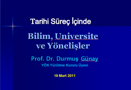 19 Mart 2011 Cumartesi 14.00’te Enstitümüz Zemahşerī Müzakere Meclisinde Prof. Dr. Durmuş GÜNAY “Bilim, Üniversite ve Yönelişler” konulu bir konferans